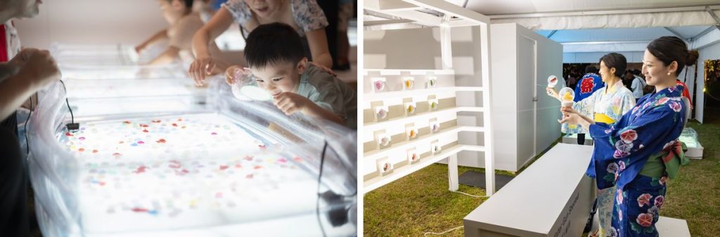麻布台ヒルズの中央広場は、提灯で彩られ麻布台ヒルズならではの人気レストランやカフェ・スィーツの名店が個性豊かなグルメ屋台を出店する。また涼し気な金魚すくいならぬ〝スーパーボールすくい〟や水てっぽうを使った射的も登場、猛暑の中での縁日といえども昔ながらの涼やかな風情を演出する。水面に浮かぶ色とりどりの見た目にも美しい「お花釣り」は、ヒルズ内の花屋「リベルテ」の花が使われ、写真映えすること間違いなしで、大都会の夏の風物詩として地域周辺はお祭り気分に包まれることになる。