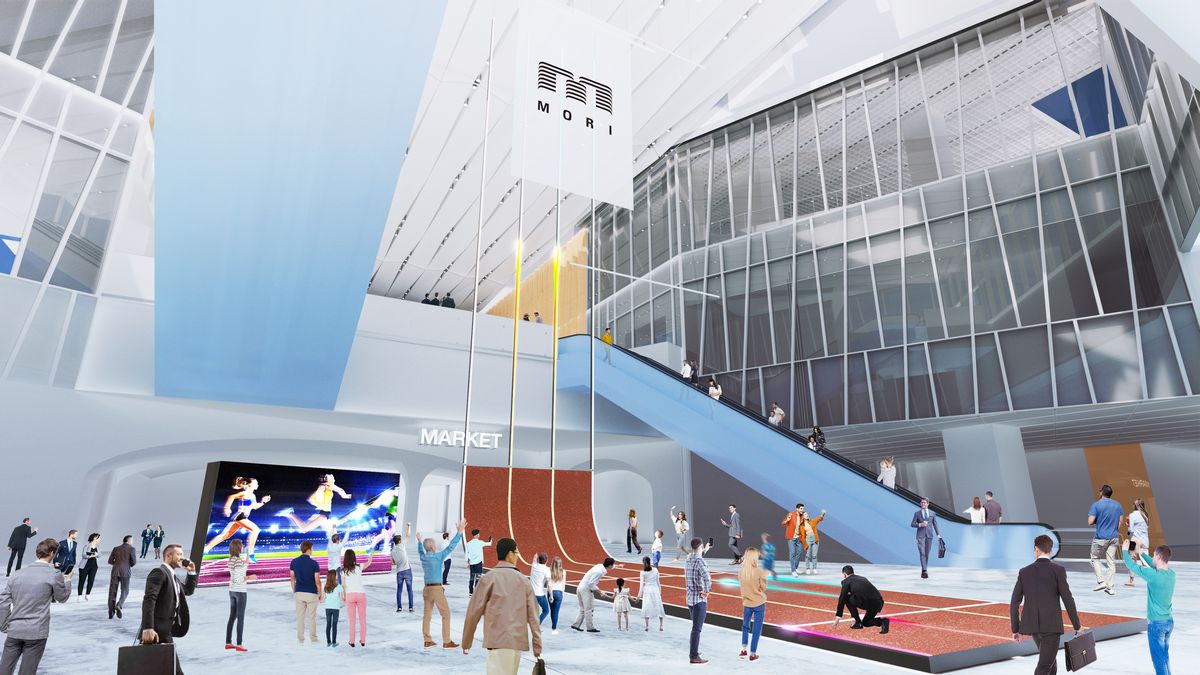 あの巨大な〈虎ノ門ヒルズ〉駅地下2階のステーションアトリウムを、パブリックビューイングの会場として開放し、TBSテレビが放送する「東京2025世界陸上」のイブニングセッション全95プログラムを200インチの大画面で生中継する。会場の熱気をそのままに、訪れた皆で観戦を楽しむことができる。会場内には、全長15mの陸上トラックが設置され、400m走の動きに連動してトラック上を走ると、ラインが光る工夫がされている。森ビルでは、「TOKYOの光を世界に届ける」をテーマに、上へと伸びる光は、TOKYOと世界を結ぶことを表現した、としている。