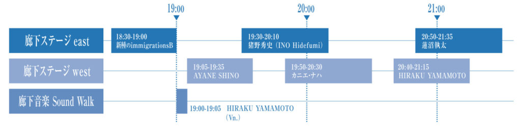 会場は廊下ステージEastと廊下ステージWestがあり、Eastでは蓮沼執太、猪野秀史 (INO hidefumi)、〈新種のImmigrationsB〉が出演、WestではHIRAKU YAMAMOTO、カニエ・ナハ、AYANE SHINOが出演予定(出演時間は下記)。また、数々のデザイン賞を受賞している、新進気鋭の建築家・津川 恵理が会場全体の空間構成を手掛けている。