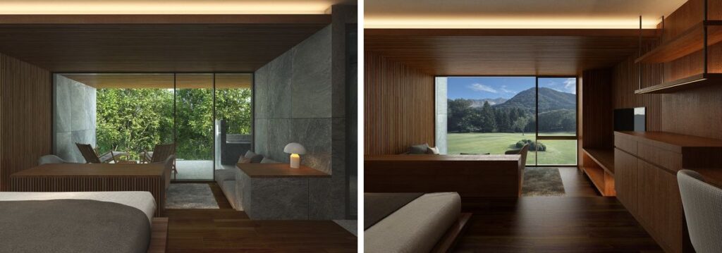 客室は、「客室棟」と「森のレジデンス棟」の全65室。大規模リニューアルする「客室棟」は59室から50室へと数を絞り、1室あたりの面積を拡張され全室温泉付き。ゆったりとしたプライベート空間が創出され、うち4室は約100㎡のスイート。「客室棟」の約半数は芝庭越しに大涌谷を望む絶景ビューを、残る半数は森林に面した静寂な眺望と半露天風呂が楽しめるという。