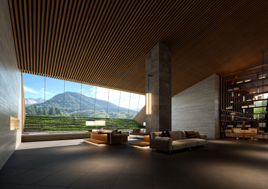 例えば到着時、これまでは、入り口から車寄せまでオープンだったが、森と絶景に包まれる静寂のアプローチが非日常の世界へと誘う演出で、あえて植栽でクローズドに設計されまるで森林の中を進むような静かな導線の先に現れるのは隠れ家のようなホテルの建屋。ロビーは、大涌谷を正面に望む南南東向きに再配置。広大な芝庭とその先に広がる「箱根外輪山の稜線」を一望できる大きな窓は、到着の瞬間から自然との一体感を感じられるよう設計。ラウンジには暖炉とバー機能が新設され、当ホテルの特長の1つとなる「薪火料理」の香りを想起させ、ゆったりとした時間の流れる空間に生まれ変わる。