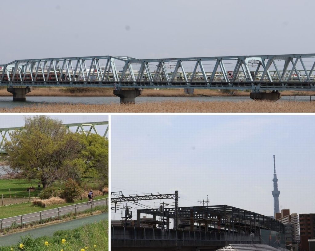 荒川を跨ぐ橋梁を一気に走るスカイライナー、八広を出発したシルバーの京成電車がゆっくりと行き、都営浅草線の赤い車両も駆け抜けていく昼下がりであった。