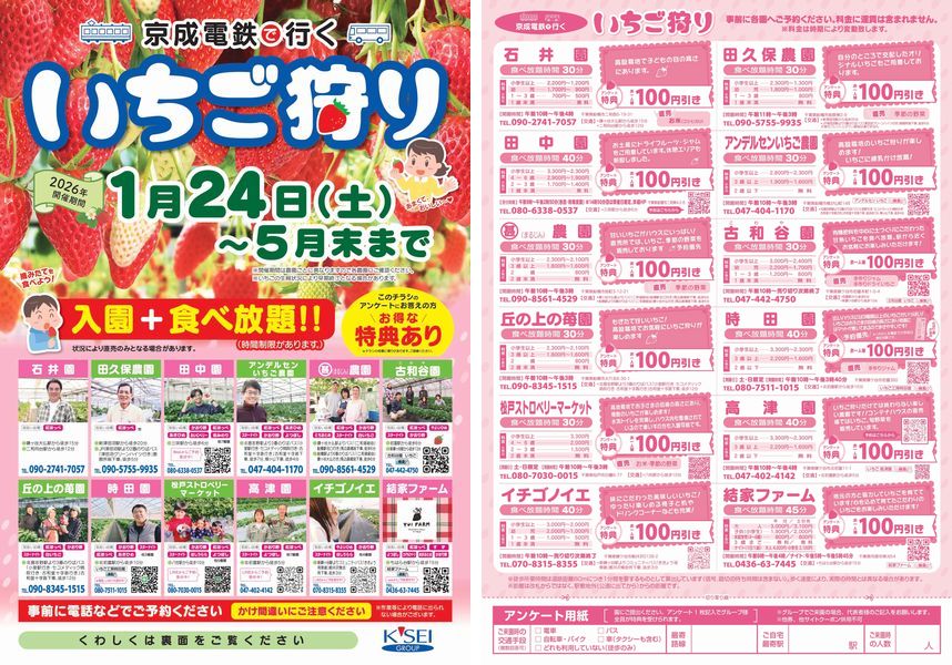 本企画は、京成電鉄各駅に設置してあるチラシのアンケートに記入し、入園の際、各農園に持参すれば通常の料金から100円引きで、いちご狩りが楽しめるというもの。