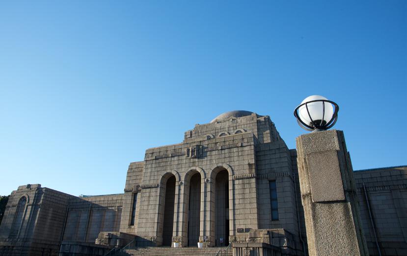 青山通りから脇に入る、長さ300メートルの銀杏並木は東京で最も美しい場所と言えるだろう。初夏の若葉、真夏の緑、秋は黄金色、冬の落葉は金色の絨穂となる。四列の並木は奥に行くほど少しずつ背を低くして求心性を強調してある。その正面が重要文化財「聖徳記念絵画館」だ。明治42年、皇太子の住まいに建てた東宮御所(現迎賓館赤坂離宮)の雄大華麗に比べ、中央正面に丸いドームを置いた左右両翼。花崗岩を積み上げた灰色一色の外観は神聖といえるが、明治天皇の遺徳を伝える絵画を展示する建物だからだ。