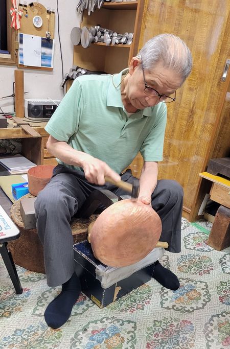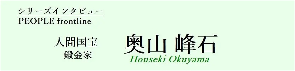 鍛金家・奥山峰石(本名・喜蔵)さんは、58歳の時に人間国宝(文化財保護法に基づき文部科学大臣が指定した重要無形文化財保持者)に認定された。当時「鍛金」の世界では最年少の認定だった。鍛金とは金属の一枚板を木槌や金槌で何百回、何千回と数えきれないほど叩き込んで形状を調え、自らデザインした文様を打ち込んで、茶道具、花瓶、酒器などがつくられる。奥山さんは米寿を迎えた現在も新しい作品づくりに挑戦する現役真っ只中である。「またお茶のみにきてください」と玄関の外まで見送ってくださった奥山さん。謙虚で優しいその人柄が作品にもあらわれている。「一代一職」を貫き、粘り強く決してあきらめない奥山さんは、人間国宝認定30年を迎えた。生まれ故郷の山形県新庄市からリレーされ、北区飛鳥山博物館で「鍛金家・奥山峰石 米寿記念展 人間国宝認定30年の軌跡」が間もなく始まる。