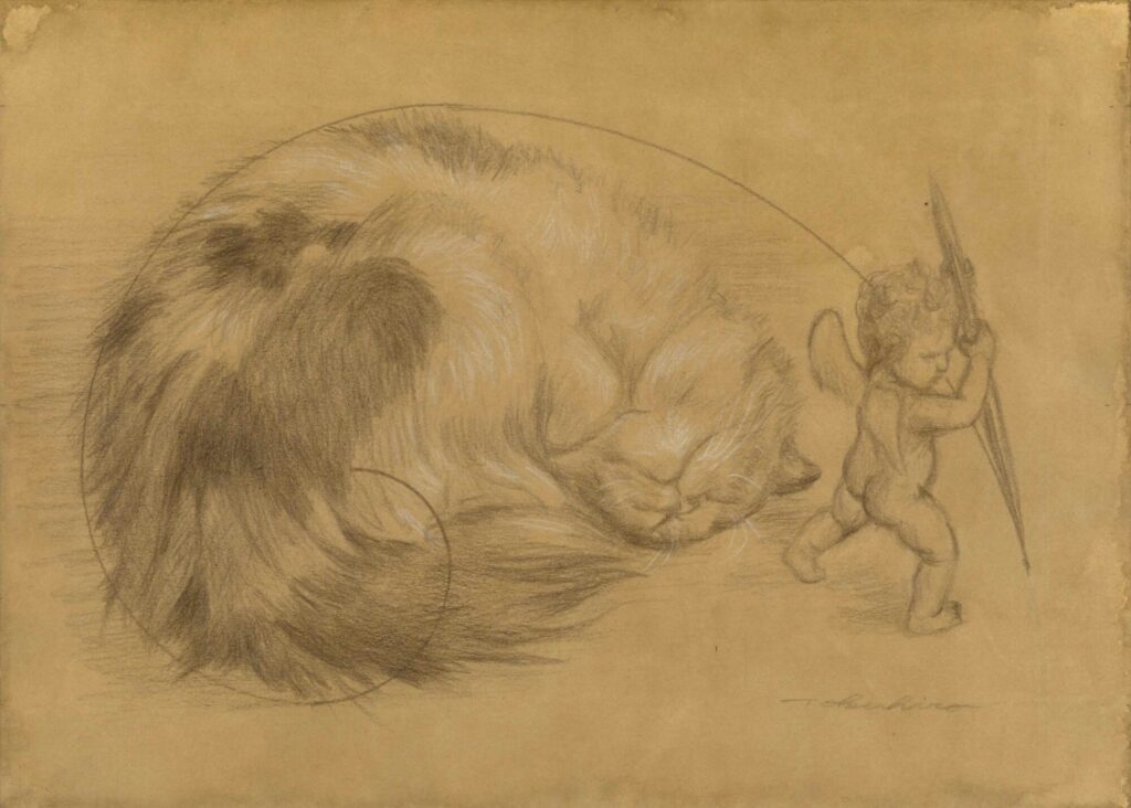 左の絵は、『猫に愛』80.5×80.5cm(額込サイズ)油性テンペラ、金箔/木材
