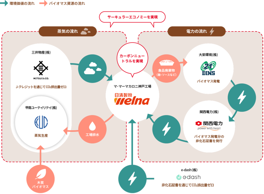 日清製粉グループには、小麦粉を主とした食品販売の〈株式会社日清製粉ウェルナ〉があり、「マ・マーTHE PASTA」や「超もち生パスタ」など冷凍パスタを販売しているが、その製造は、〈マ・マーマカロニ株式会社〉神戸工場が担当。このほど両社がタッグを組んで製造過程のエネルギー使用に伴うCO2排出量を実質ゼロにするカーボンニュートラルが実現した。この取組みは、生産切り替え時や清掃時に発生する少量の麺やソースの残り、検査等に使用した製品なども含まれているが、そうした食品廃棄物を活用したバイオマス発電と環境負荷の低い蒸気の活用に秘密がある。電力と蒸気の使用によってCO2排出量を年間5,200トン削減となる。