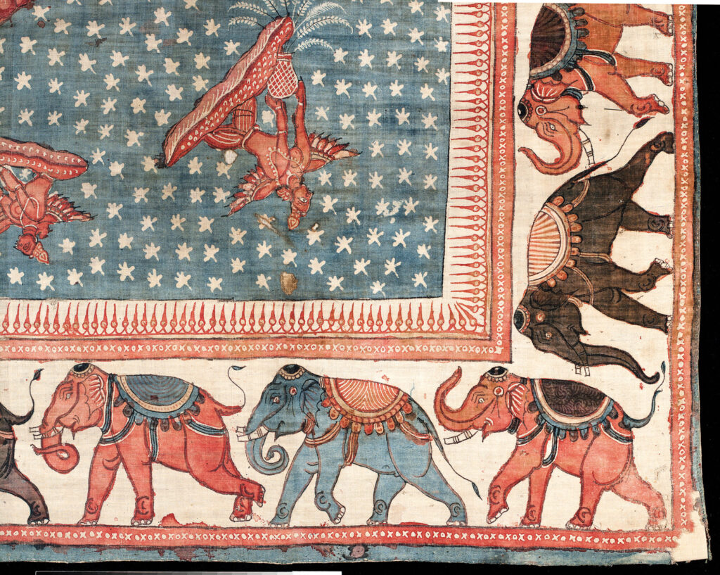 インド更紗は数千年の歴史を持ち、衣服や宗教儀式、室内装飾など様々な用途に使われてきた。天然素材の茜と藍を巧みに使い、染織の難しい木綿布を鮮やかに染め上げた更紗は伸びやかで濃密な文様が特徴で、染色の驚異的な堅牢性も世界の人々を驚かせた。