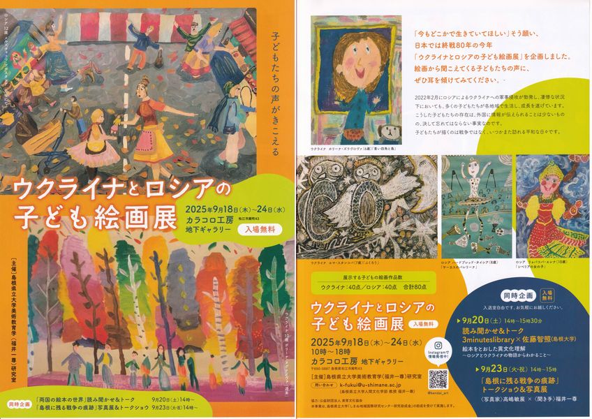 島根県立大学 美術教育学(福井一尊)研究室では、未だ戦争状態にあるウクライナとロシアの子どもの絵を計80点展示する。戦火の中でも子どもは未来に期待し、成長している。こうした子どもたちの存在は、諸外国に情報が伝えられることは少ないものの、決して忘れてはならない。