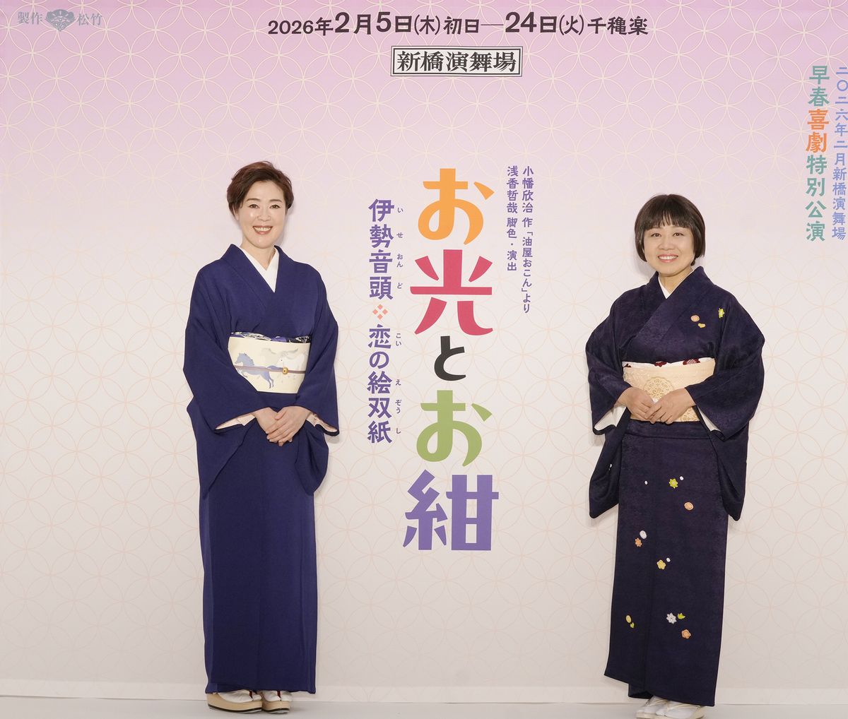新橋演舞場、大阪松竹座、南座などでの喜劇公演で年間複数の舞台の主役を務める現代を代表する喜劇役者・藤山直美と、国際映画祭で最優秀女優賞を受賞するなど国際的にも高い評価を受け、昨年の歌舞伎座・十二月大歌舞伎『芝浜革財布』をはじめ舞台でも意欲的な活躍を見せる寺島しのぶという華も実もある当世きっての人気俳優が、舞台『お光とお紺~伊勢音頭 恋の絵双紙~』で12年ぶりとなる共演を果たす。