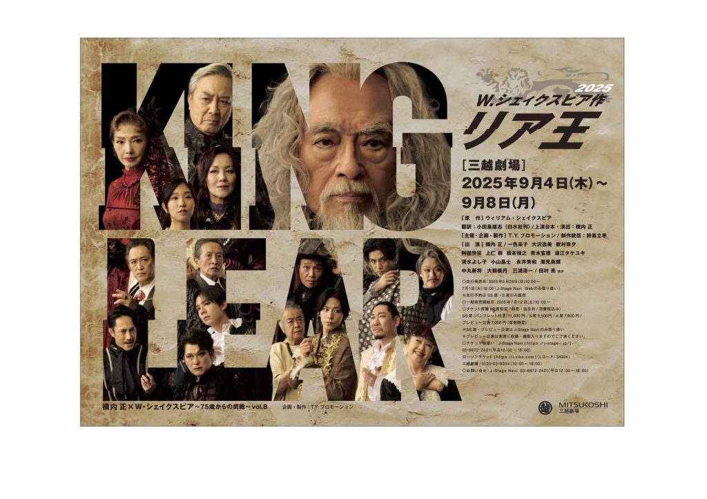 「横内正✖シェイクスピア」通算8作目は、俳優 横内正が演じ続け今回84歳で6度目の主演となる『リア王』。もちろん演出・上演台本も手がける。盟友田村亮を迎え、炎天下の稽古を経て9月「三越劇場」で上演!