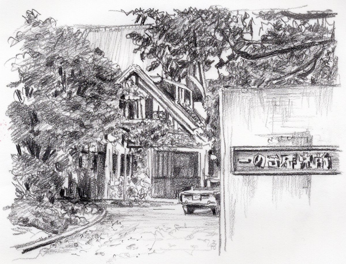 妻(東郷晴子)と娘に支えられ、一の谷研究所をタクシーで去った男が、再びいきなり車を停めて飛び出していくのは成城南口商店街(註6)の通り。場所は、現在の「マツモトキヨシ」の位置にあった「武平薬品商事」前で、同じ薬局というのは偶然にしては出来過ぎの感がある。よく見ると、その向かい側には魚屋の他、上敷・ゴザを扱う店もある。1965年当時、「成城にもこんな庶民的な店があったのか」と驚かれる方も多かろう。