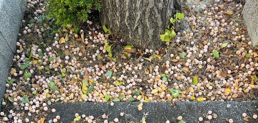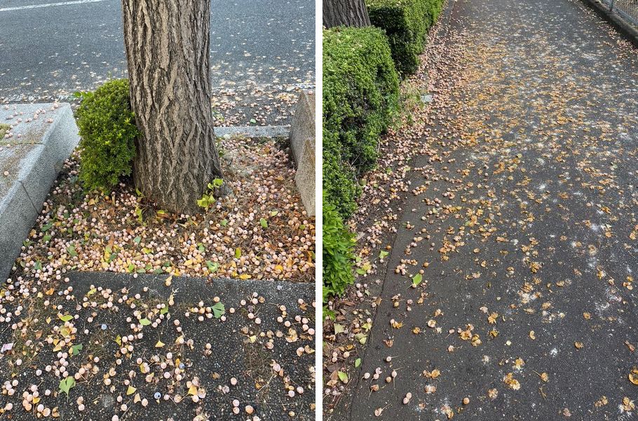 歩道を埋め尽くすから、匂いもきつい。拾って持ち帰りたいけど、処理の方法が分からないので、残念でならない。