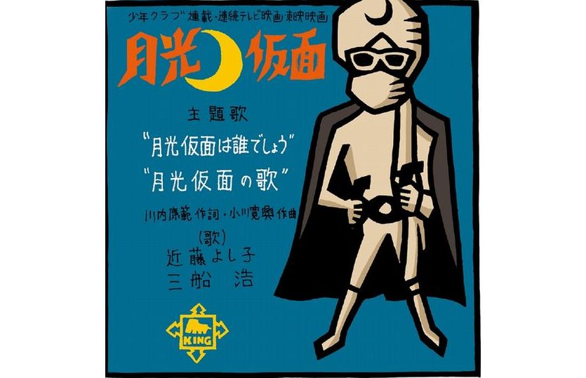 あらためて調べてみると、楽曲名「月光仮面は誰でしょう」(作詞:川内康範、作曲:小川寛興)は昭和33年(1958)2月24日から翌年7月5日まで、KRT(現:TBSテレビ)系列で放映された子供向けの冒険アクションの連続ドラマ『月光仮面』の主題歌だった。残念なことにボクは当時リアルタイムで観ていたかどうか定かではない。近所の裕福な家にあったテレビ受像機なのか、すでに我が家にあったのかどうか、判然としないのだ。むしろ、テレビの『月光仮面』が大ヒットして間もなく地元の東映系映画館のスクリーンで観た情景(シーン)のほうが、はっきりと浮かんでくる。モノクロ映画ゆえのコントラストで真っ白い上下の衣装と覆面に白いマントをまとい黒いサングラスの月光仮面が〝どくろ〟の仮面を被った悪人どもの前に満を持して登場すると、ワクワクドキドキしながらスクリーンに見入ったものだった。どくろ仮面を蹴散らすと、電光石火の早業でオートバイに乗って去って行く、なぜかエンドロールの「終」の文字が浮かび出てくる直前までのシーンが焼き付いているのだ。(ただしこのシーンはシリーズ全編なのか、一部なのか自信はない)。その間に主題歌「月光仮面は誰でしょう」が流れていた。暗い映画館の客席で、一緒に歌い「終」と同時に拍手が沸いた(と思う)。悪を懲らしめ振り返ることもなく月の光の中に消えていく格好良さに、ボクら子供たちはみんな興奮していたのだった。
