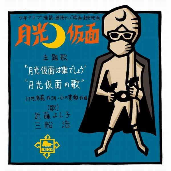 あらためて調べてみると、楽曲名「月光仮面は誰でしょう」(作詞:川内康範、作曲:小川寛興)は昭和33年(1958)2月24日から翌年7月5日まで、KRT(現:TBSテレビ)系列で放映された子供向けの冒険アクションの連続ドラマ『月光仮面』の主題歌だった。残念なことにボクは当時リアルタイムで観ていたかどうか定かではない。近所の裕福な家にあったテレビ受像機なのか、すでに我が家にあったのかどうか、判然としないのだ。むしろ、テレビの『月光仮面』が大ヒットして間もなく地元の東映系映画館のスクリーンで観た情景(シーン)のほうが、はっきりと浮かんでくる。モノクロ映画ゆえのコントラストで真っ白い上下の衣装と覆面に白いマントをまとい黒いサングラスの月光仮面が〝どくろ〟の仮面を被った悪人どもの前に満を持して登場すると、ワクワクドキドキしながらスクリーンに見入ったものだった。どくろ仮面を蹴散らすと、電光石火の早業でオートバイに乗って去って行く、なぜかエンドロールの「終」の文字が浮かび出てくる直前までのシーンが焼き付いているのだ。(ただしこのシーンはシリーズ全編なのか、一部なのか自信はない)。その間に主題歌「月光仮面は誰でしょう」が流れていた。暗い映画館の客席で、一緒に歌い「終」と同時に拍手が沸いた(と思う)。悪を懲らしめ振り返ることもなく月の光の中に消えていく格好良さに、ボクら子供たちはみんな興奮していたのだった。