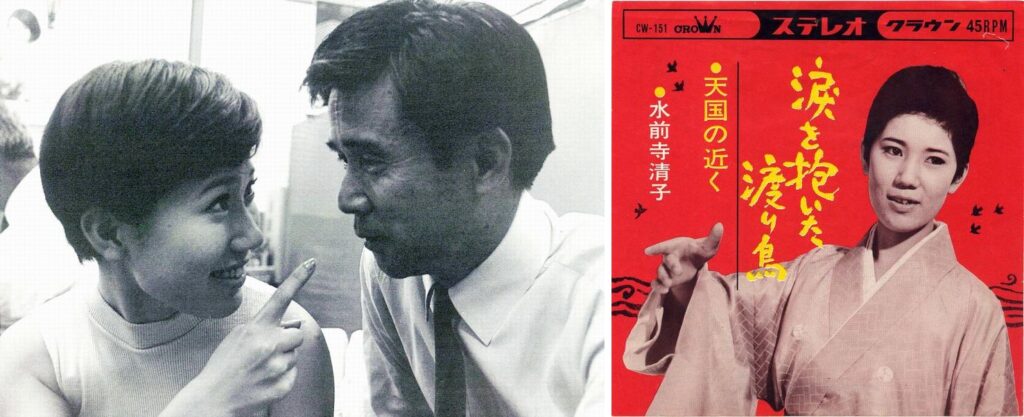 右:1964年10月15日発売水前寺清子「涙を抱いた渡り鳥」。星野哲郎の作詞だが名義は有田めぐむとなっている。星野が日本コロムビア専属歌詞のときに書いた作品であり、星野哲郎と名乗れない苦肉の策だったようである。作曲の市川昭介もコロムビア専属の作曲家だったため、いづみゆたか名義になっている。