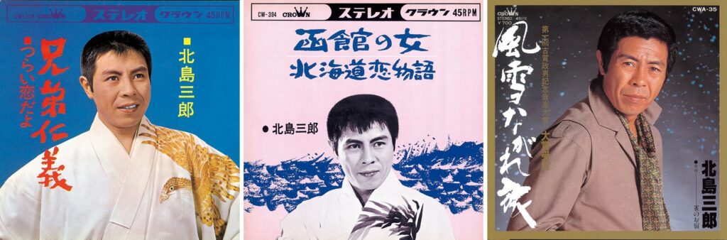 右:1980年9月15日発売北島三郎「風雪ながれ旅」。作曲を船村徹が手がけた、津軽三味線奏者の高橋竹山の生涯を元にした楽曲で、第1回古賀政男記念音楽大賞を受賞した。紅白歌合戦では7回歌唱しており、大量の紙吹雪が舞う演出が定番だった。