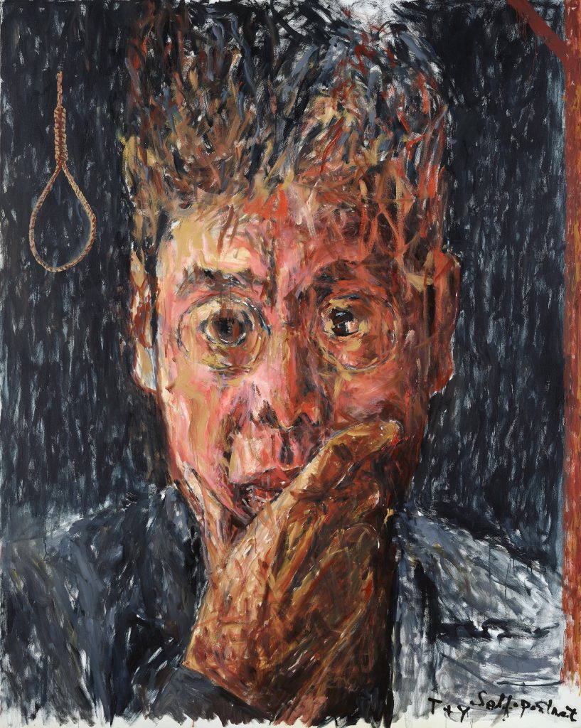 荒々しい筆触の巨大な自画像は、力強いとともに内省的である。最後に加えられた首吊り綱が印象的である。