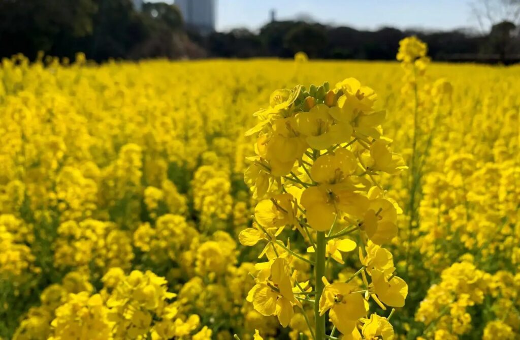 菜の花は、畑や川沿いに咲くイメージだが、都会のど真ん中の庭園に約30万本の鮮やかな黄色の花で埋め尽くされる。見頃は2月中旬から3月下旬。東京の菜の花の見頃と比べると少し時期が早い。