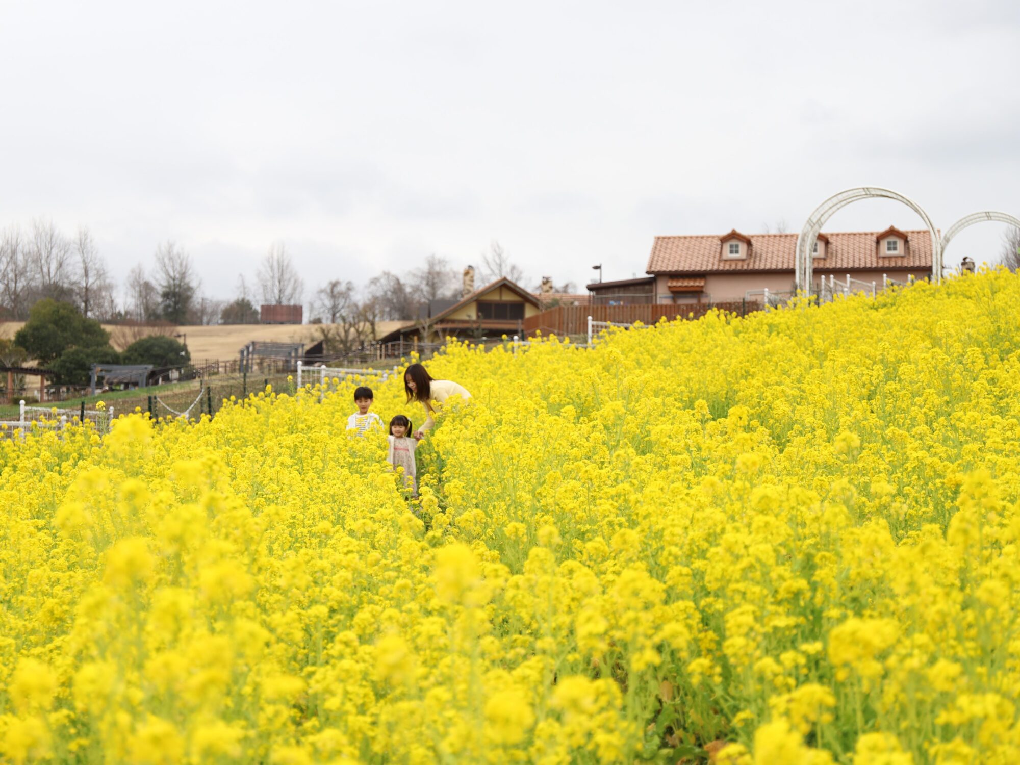マザー牧場は、250ヘクタールの広大な敷地の中で牛や羊、馬、アルパカなど動物たちとのふれあい体験ができる。菜の花や桃色吐息(ベチュニア)などの季節の花畑が咲き、バンジージャンプやジップラインなどのアトラクション、ソフトクリームやジンギスカンなどの牧場グルメもある。さらに牧場内には宿泊できるグランピング施設も揃い、まさに花と動物たちのエンターテインメントファームである。この時期、菜の花をイメージした限定ドリンクには、マザー牧場のソフトクリームが乗った「菜の花クリームソーダ」も登場する。