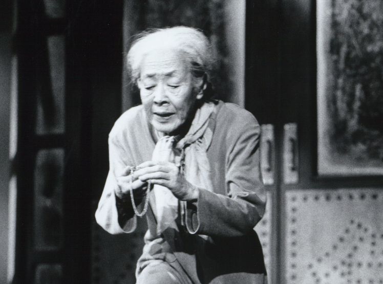 さらに舞台でも、81年に松本克平と二人芝居『八月に乾杯』に出演、全国各地で好評を博した。89年劇団俳優座公演『有福詩人』で演じたおかよ の演技で紀伊國屋演劇賞個人賞を受賞。92年には、日本の中国侵略政策により、”満州”に送り込まれ、敗戦後の長い間置き去りにされた中国残留婦人の悲しみと怒りを描いた『とりあえずの死』でハルビン外僑養老院に住む日本人の一人、桜井芳を演じた。『とりあえずの死』は地方でも巡演することになり、前橋市で巡演中の93年10月9日に帰らぬ人となった。享年88歳。劇団葬が営まれた。