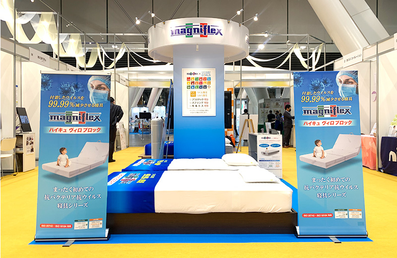 マニフレックスは「スマートな働き方企画展示」のエリアの中央に、抗バクテリア抗ウイルス寝具『マニフレックス ヴィロブロックシリーズ』を中心に出展している。
