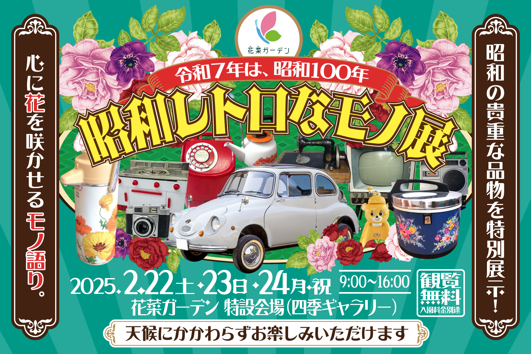 『花菜ガーデン』では、2025年2月22日(土)~24日(月・祝)に〈昭和レトロなモノ展〉を開催。これは、令和7年が昭和100年にあたることにより、昭和の貴重な品々100点以上が展示される。昭和世代には懐かしく、昭和を知らない世代には、新しい感覚なのではないだろうか。