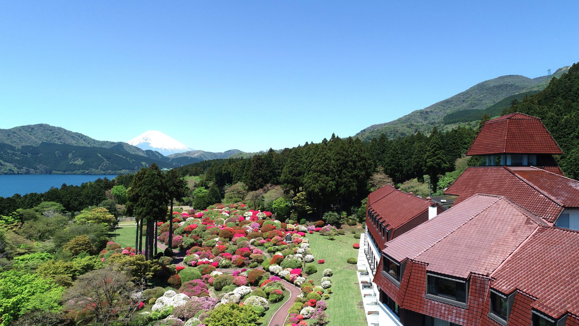 壮大な富士山や芦ノ湖をバックにツツジが咲き誇る、100年前と変わらぬ絶景は、箱根・芦ノ湖畔に建つ〈小田急 山のホテル〉ならでは。