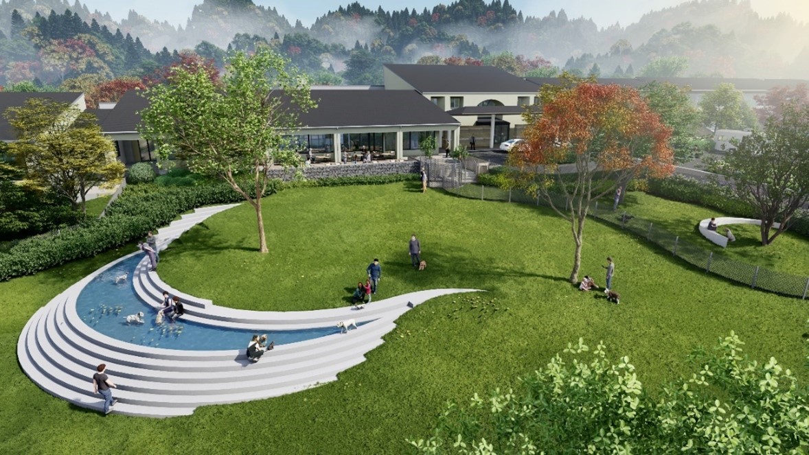 特長的な設備の一つは、何といっても関東最大級の規模になる約2,200㎡の広大な天然芝のドッグパーク。愛すべきワンちゃんが雄大な箱根の自然の中で自由に駆けまわるのは、飼い主にとっても喜ばしいことだろう。また森の散歩道をイメージしたドッグガーデン、全天候型の屋内ドッグランも完備し、いつでも元気な愛犬の姿を見守ることができる。全15室の客室は、約60~200㎡の広々としており全室に温泉が配備されている。1階の客室には100㎡を超えるプライベートドッグラン、2階の客室にはインナーバルコニーが設けられ、プライベートな時間も保たれる。温かみのある木材を多用した室内は、愛犬専用のトイレ、ベッド、アメニティも充実し、犬種・頭数を気にせず、愛犬とともに飼い主もリラックスできる空間となっている。