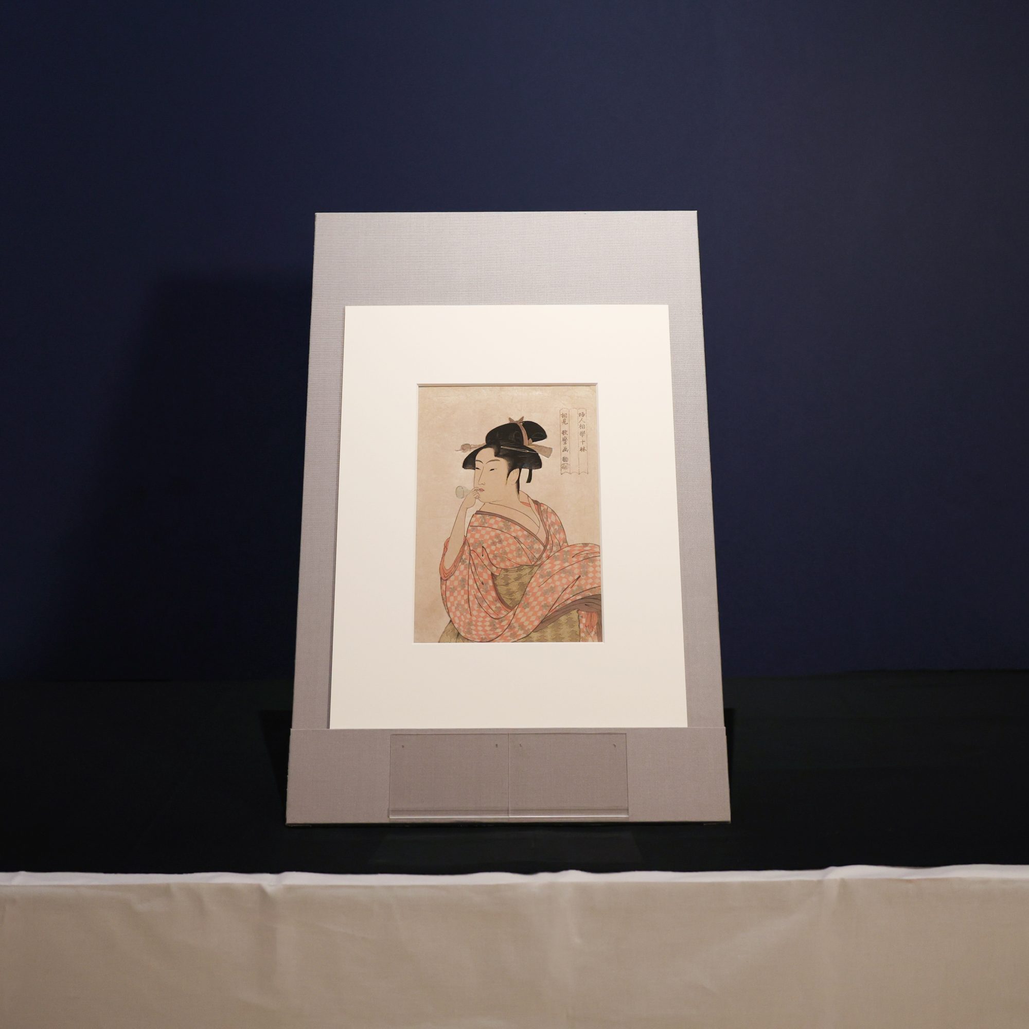「ポッピンを吹く娘」 は、「十躰」「十品」両シリーズ名で出版された貴重な作例で、とくに「十躰」の題名をもつ作品は、初期に摺られた点で極めて重要であり、現存例は世界的にも稀である。本出品作が発見されるまでは、ホノルル美術館に所蔵される1枚のみが知られていた。一方、「十品」は、東京国立博物館、メトロポリタン美術館などで数点、現存されている。