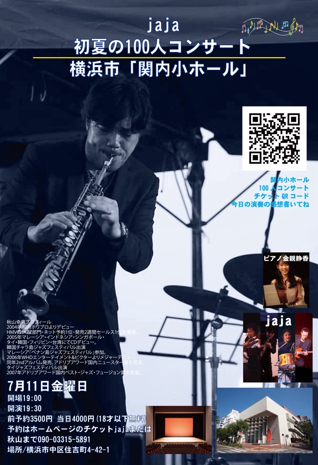 さらに、7月11日(金)には、横浜の関内ホールで100人規模のホール公演も決まった。ライブハウスとはまたちがった、広がりのある音響空間で、<jaia>のジャズに親しむことができることだろう。