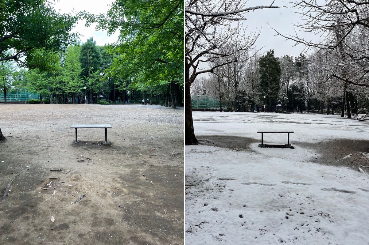 今年は3月なのに雪が降った。さすがに寒いので、ランニングや散歩する人はいない。足跡は鳥だけだった。途中から雨に変わったので、地面がぬかるんでくる。その変化も撮影したいので、同じ箇所を何度か周り続ける。身体はガタガタ、息は絶え絶え。手はかじかんで動かない。だけど、心だけはかじかまない。