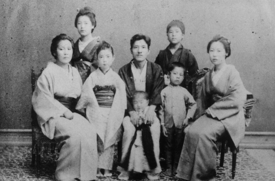 ▲写真左は、筆者の曾祖父・萩原密蔵 萩原家は大阪府下で代々開業医をしていた。密蔵は三男で、東京大学医学部別課を卒業。卒業成績は1番だった。前橋へは、明治15年1月に群馬県立病院の医員になって赴任。そして、18年11月に開業した。写真右は、明治25年の萩原家。前列右から曾祖母ケイ、祖父の朔太郎、曾祖父の密蔵に抱かれた朔太郎の妹のワカ。