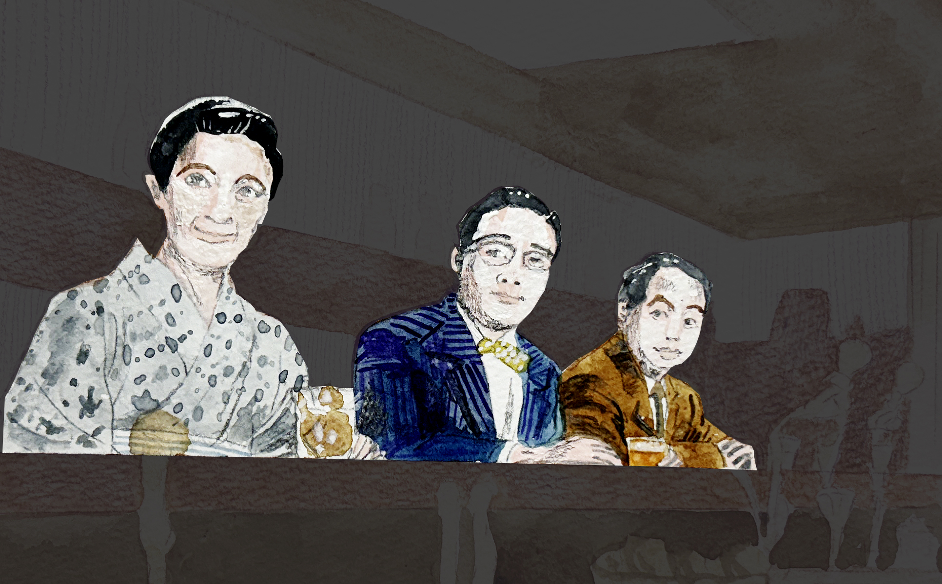 ▲さぞかし緊張感のある現場であったろう『小早川家の秋』。原節子や加東大介は、小津と森繁の確執をどう見ていたのだろうか(イラスト:Produce any Colour TaIZ/岡本和泉)