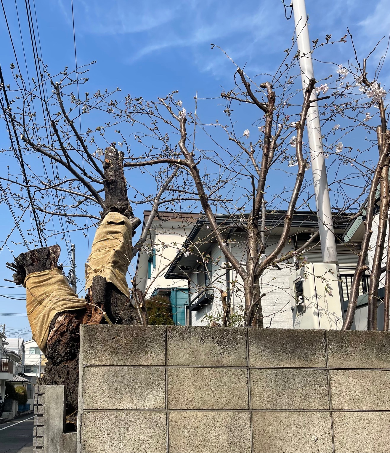 散歩の途中で、咲き始めの桜の樹を見かけた。老木と若木が並んでいる。多分、もうすぐ朽ちてしまいそうなので、隣りに新しい樹を植えたのだろう。